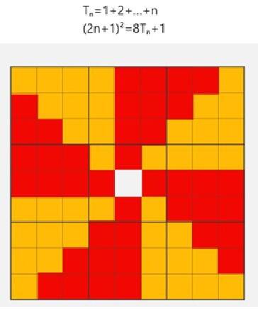 Hieronder staat een bewijs zonder woorden voor de somformule 1 + 2 + 3 + ... + n = n(n + 1)/2.