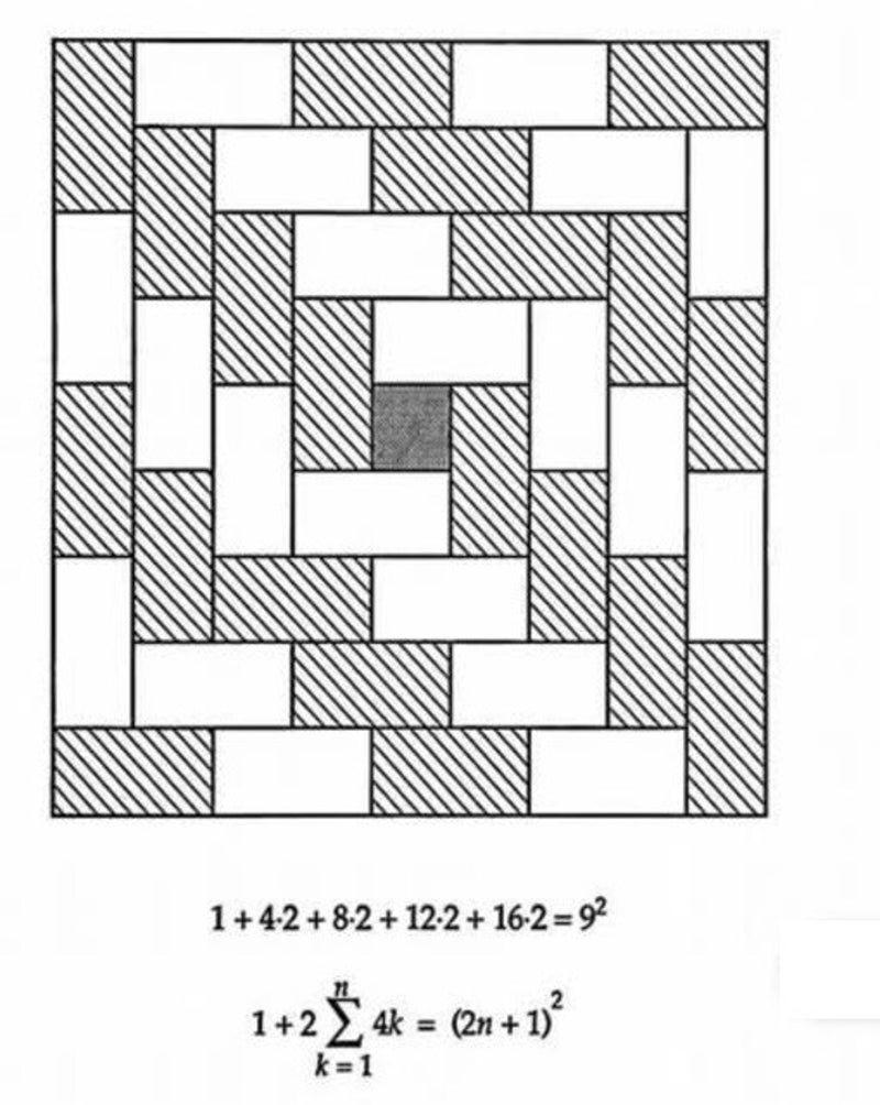 En hieronder zie je waarom 1 + 3 + 5 + ... + (2n – 1) = n².